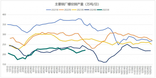2025年6月下旬,重点统计钢铁企业共生产粗钢2129万吨,平均日产212.9万吨,日产环比下降0.9%;生铁1953万吨,平均日产195.3万吨,日产环比增长0.3%;钢材2257万吨,平均日产225.7万吨,日产环比增长6.4%。