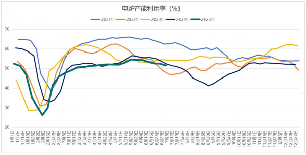 数据来源:英大期货,Wind短流程钢厂面临亏损压力,电炉产能利用率连续第六周下降。91家电炉钢铁企业平均产能利用率51.47%,环比上周减少0.89个百分点,同比减少0.70个百分点;短流程钢厂电炉产能利用率50.00%,环比减少1.51个百分点;长流程钢厂电炉产能利用率53.58%,环比上周减少0.00个百分点。91家电炉钢铁企业电炉开工率为58.97%,环比上周减少2.57个百分点,同比去年减少1.93个百分点;其中,短流程钢厂电炉开工率63.54%,环比减少4.17个百分点;长流程钢厂电炉开工率51.67%,环比上周保持不变。