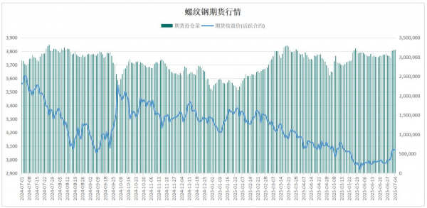 重要会议释放利好,螺纹钢走强,周线三连阳。主力合约RB2510周内最低价2977元/吨,最高价3095元/吨,收盘于3072元/吨,周涨幅2.57%。截至7月4日收盘,螺纹钢期货总持仓3186086手,环比上周增加142082手。
