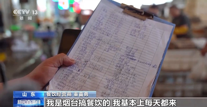 餐饮经营商 董喜勇:我是烟台这里搞餐饮的,我基本每天都来,这个市场食材比较全,除了海鲜还有蔬菜、肉食、蛋类、粮油、调料,一般一站式就能买齐了。