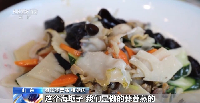 餐饮经营商 柳尧庆:你买的这几种海鲜都是我们烟台的代表。海肠捞饭是我们烟台的一张城市名片,海螺我们做的是一螺两吃,海蛎子我们是做的蒜蓉蒸的。海蛎个头比较大,相当于手掌这么大,马粪胆是有糯、甜、鲜的特点。