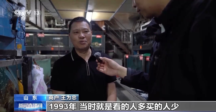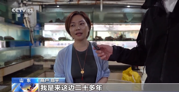 商户 郑平:我是来这边二十多年,最旺的时候一天能出个几百斤,单单是帝王蟹和龙虾之类的,鲍鱼基本上一天能出个一千斤左右。我们的客源很广,这个市场的人都比较诚信,价格也比外面实惠。