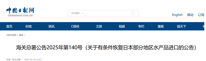 据中国日报网6月29日的报道,中国海关总署发布通报,部分日本水产品恢复进口。