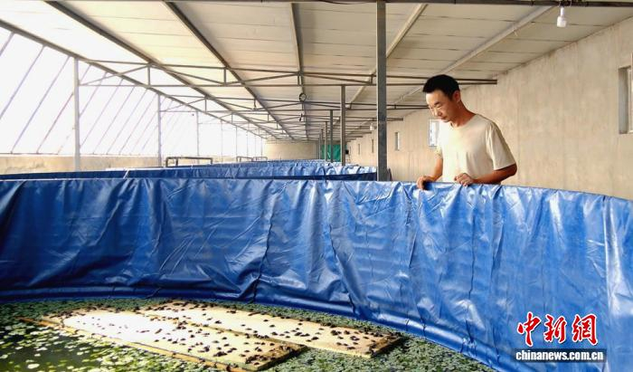 近日,走进新疆兵团第十三师新星市红星二场的新型设施农业示范基地,工人正在设施大棚内查看中华鳖苗生长情况。